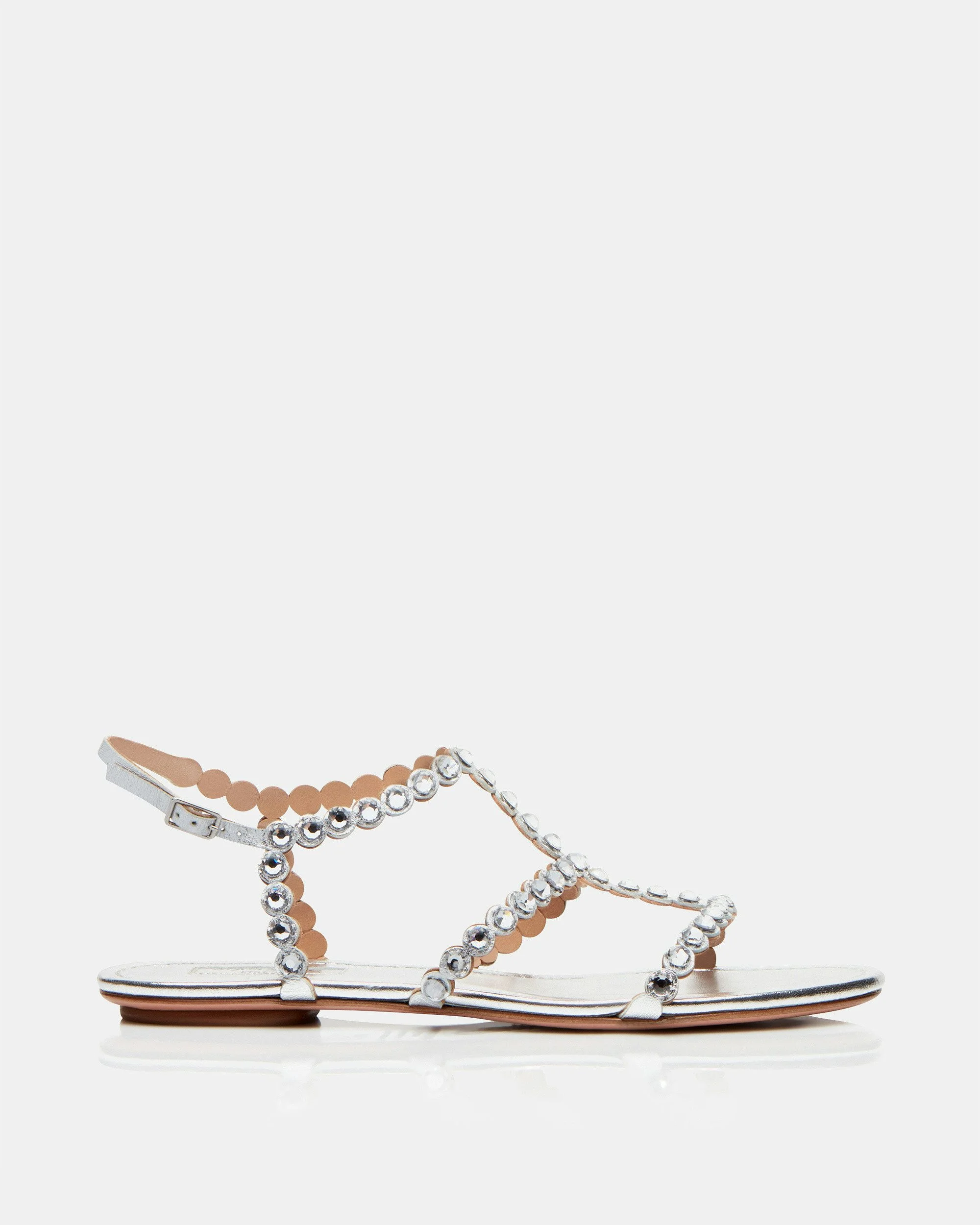 Our Tequila Sandals will add extra glam to your vacation wardrobe. Made in Italy from sleek metallic leather in shimmery silver, the strappy design is finished with glittery gems which makes the style perfect for day or night ensembles alike. Adjustable buckle closure Leather lining Leather insole with Aquazzura stamped in gold Leather sole with embossed Pineapple logo Product: TQLFLAS0-NPL-CCC Made in: Italy