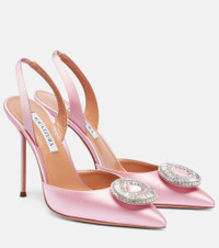 An Aquazzura shoe is a labor of love: a single pair can include over 30 components, each of which is hand-assembled by skilled artisans. Crafted from satin, the Crystal Hoop 105 slingback pumps are named after the glamorous embellishments on the uppers. Product Details - Upper: satin - Lining: leather - Sole: leather insole and sole - Toe shape: pointed toe - Made in Italy - Includes: shoe box, dust bag - Designer color name: Light Rose - Item color: pink - Contains non-textile parts of animal origin - Item number: P01077744 Size & Fit - True to size - European sizes - 10,5cm-4" heel (size EU 38)