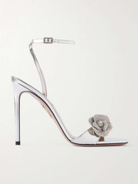 Aquazzura's sandals are embellished with crystal-encrusted floral appliques that add beautiful dimension and sparkle. They're made from reflective mirrored-leather for a beautiful shine and have 105mm stiletto heels and slim, adjustable ankle straps. Wear them with cropped hems to showcase the details. Size & Fit - Fits true to size, take your normal size - Those with wide feet may wish to take the next half size up - Italian sizing Details & Care - Heel measures approximately 105mm/ 4 inches - Silver mirrored-leather (Calf) - Buckle-fastening ankle strap