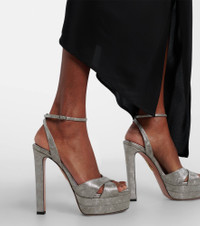 An Aquazzura shoe is a labor of love: a single pair can include over 30 components, each of which is assembled by skilled artisans. Crafted from textured silver-hued metallic leather, the Divine sandals rest on 130mm heels and 40mm platforms. Product Details - Upper: calf leather - Lining: leather - Sole: leather insole and sole - Color: silver - Toe shape: almond open toe - Made in Italy - Includes: dust bag, shoe box - Designer color name: Silver - Item color: silver - Hardware color: silver - Closure: buckle-fastening ankle strap - Item number: P01138015 Size & Fit - True to size - European sizes - 13cm-5" heel - 4cm-1.5" platform