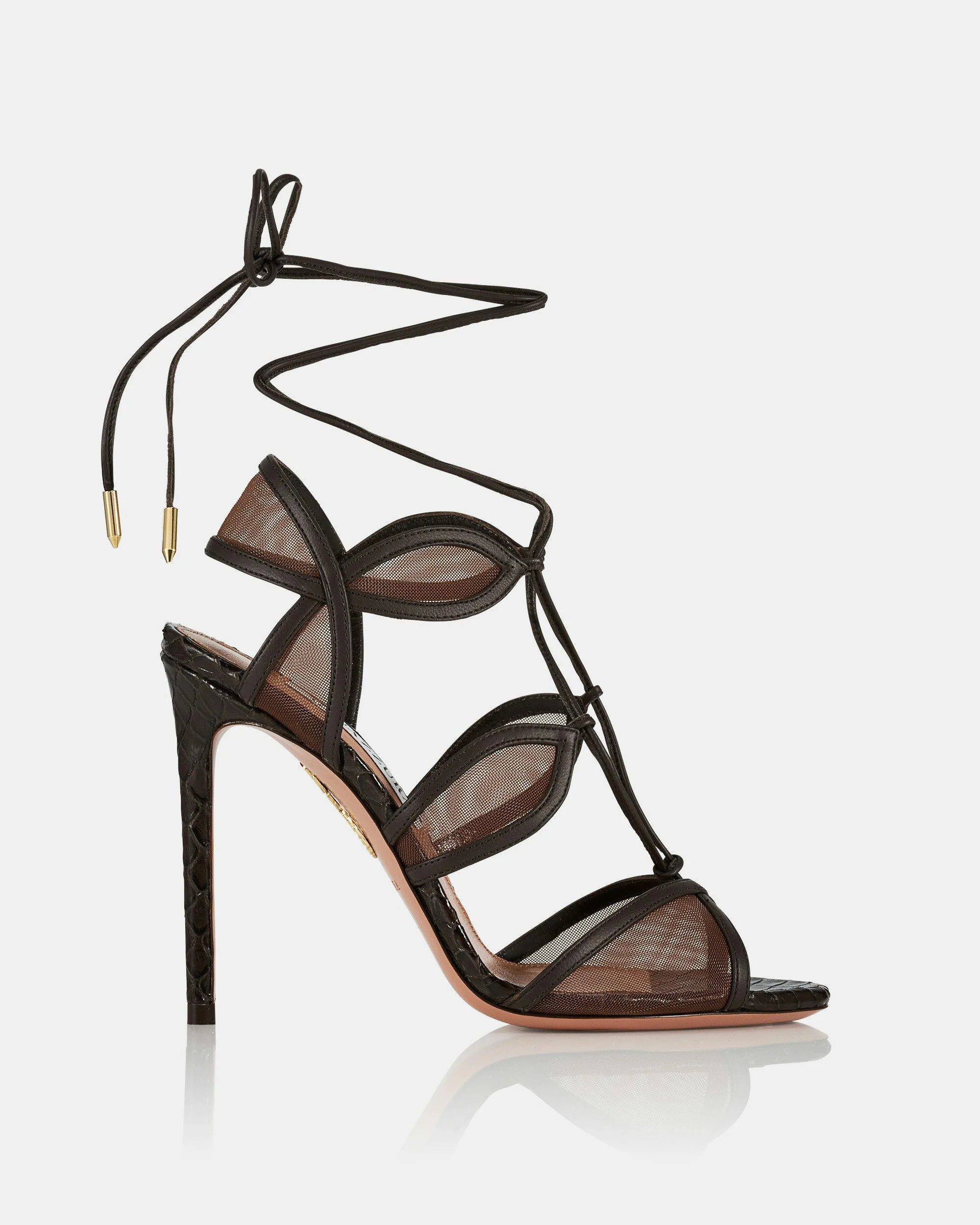 No party look is complete without fancy footwear, so be sure to amp up the glamour with our Fatal Attraction Sandals. They're made from brown python-effect leather and lustrous satin with airy mesh inserts adding textural intrigue. Pair yours with cropped hems to keep the ankle ties in view. Ankle ties Stiletto heel Padded leather insole Signature logo detailing Product: FTAHIGS0-NFY-ESP Made in: ITALY