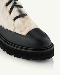 Destined to toughen up dresses and relaxed weekend ensembles, the Furry Combat Booties are the ideal choice when the temperatures drop. Crafted from cream shearling and black leather, they have round toes and chunky rubber soles for a subtle lift. Pull tabs make them easy to slip on and off. Pull on Lug sole Padded leather insole Signature logo detailing Product: FYBFLAB0-SGE-PNK Made in: Italy
