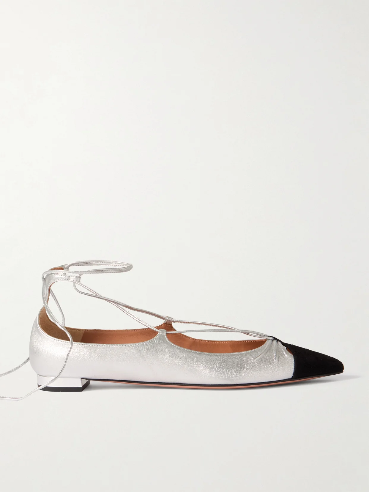 Aquazzura's footwear is always meticulously crafted in Tuscan workshops using traditional techniques, proving its commitment to quality. These ‘Gabi' flats are made from silver leather and have sleek pointed toes with gathered and cutout details. The lace-up ties wrap around the ankle, while the heels add a slight lift.
