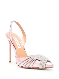 Gatsby 105mm slingback pumps Aquazzura's Gatsby pumps were born out of the designer Edgardo Osorio's desire to 'create the perfect party shoes', drawing inspiration from 1920s glamour. Rested atop a towering stiletto heel, they are crafted from metallic patent leather to a slingback silhouette with a sharp pointed toe wrapped in interweaving crystal straps, evoking a dazzling look. Highlights - Pink - Calf leather - Patent finish - Metallic finish - Knot detailing - Crystal embellishment - Pointed toe - Elasticated slingback strap - 105mm stiletto heel - Branded leather insole - Leather lining Made in Italy Composition Outer: PVC 100% Lining: Calf Leather 100% Sole: Calf Leather 100% SIZE & FIT Measurement HEEL 4.13 in(10.5 cm)