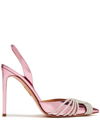 Gatsby 105mm slingback pumps Aquazzura's Gatsby pumps were born out of the designer Edgardo Osorio's desire to 'create the perfect party shoes', drawing inspiration from 1920s glamour. Rested atop a towering stiletto heel, they are crafted from metallic patent leather to a slingback silhouette with a sharp pointed toe wrapped in interweaving crystal straps, evoking a dazzling look. Highlights - Pink - Calf leather - Metallic finish - Pointed toe - Crystal embellishment - Branded insole - Slingback strap - High stiletto heel - 105mm heel height Composition Outer: Patent Leather 100% Sole: Leather 100% Lining: Leather 100%