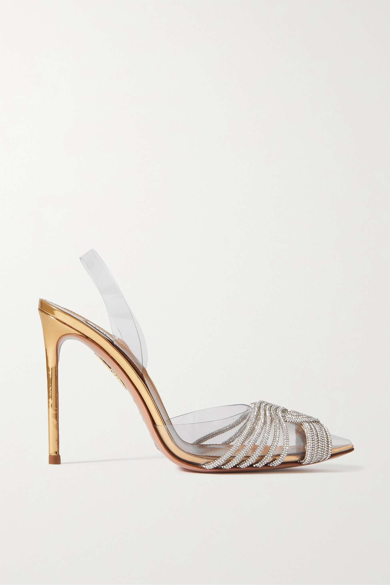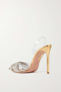 EDITORS'NOTES Aquazzura's 'Gatsby Sling' pumps are named after F. Scott Fitzgerald's novel, and they're golden just like the Roaring '20s. Made from metallic leather with a matching pineapple at the sole, they're detailed with clear PVC and twinkly crystals. SIZE & FIT - Fits small to size, take a half size larger than normal - Italian sizing DETAILS & CARE - Heel measures approximately 105mm/ 4 inches - Clear PVC, gold leather (Lamb) - Slingback strap Small to size. See Size & Fit notes.