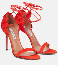 The Hibiscus sandals from Aquazzurra reimagine exotic tropical flowers in a one-of-a-kind design. Crafted from buttery red suede, this pair features a blossoming petal construction and leaf-shaped ankle ties, set atop 105mm stiletto heels. Product Details - Upper: leather (suede) - Lining: leather - Sole: leather insole and sole - Toe shape: almond open toe - Made in Italy - Includes: shoe box, dust bag - Designer color name: Strawberry - Item color: orange - Closure: lace-up - Item number: P01014369 Size & Fit - True to size - Slightly narrow - European sizes - 10,5cm-4" heel (size EU 38)
