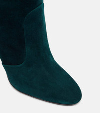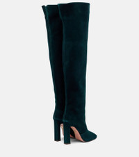 An Aquazzura shoe is a labor of love: a single pair can include over 30 components, each of which is hand-assembled by skilled artisans. Made in Italy from green suede, the Joplin boots sit just between knee-high and over-the-knee length and rest atop 105mm heels. Product Details - Upper: goat leather (suede) - Lining: leather - Sole: leather insole and sole - Toe shape: almond toe - Made in Italy - Includes: dust bag, shoe box - Designer color name: English Green - Item color: green - Hardware color: silver - Closure: zipped side - Item number: P01119680 Size & Fit - True to size - European sizes - 10,5cm-4" heel (size EU 38) - 59cm-23" shaft height (size EU 38) - 40cm-15.5" shaft width (size EU 38) - shaft width measured on largest part of boot