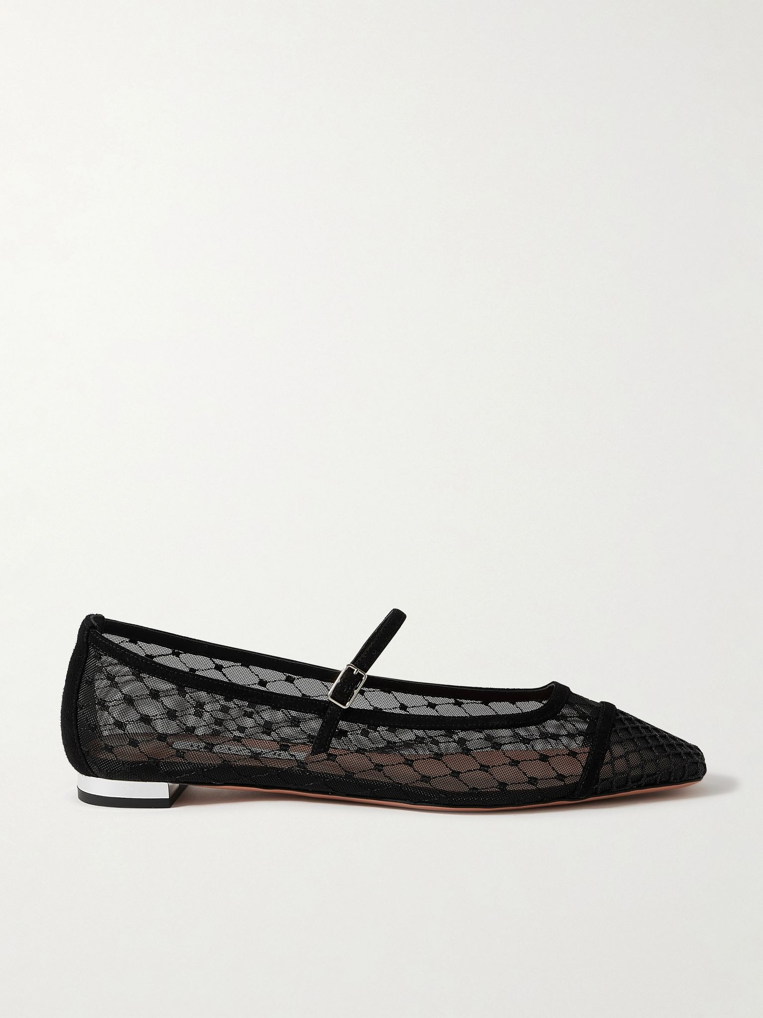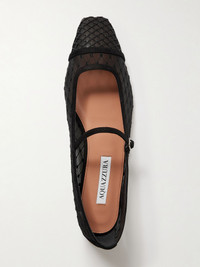 Aquazzura's 'Juliette' flats combine the chic look of Mary Janes and pointe-style ballet flats. They're made from structured mesh embroidered with the tiny dots and a diamond motif and have tonal velvet trims. The metal-tipped heels are a brand signature. Size & Fit - Fits true to size, take your normal size - Italian sizing Details & Care - Slight heel - Black mesh and velvet - Buckle-fastening strap