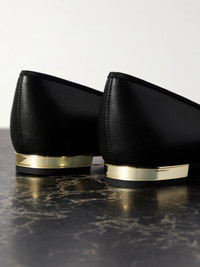 Aquazzura's 'Maia' flats have a d'Orsay silhouette and a sleek gold-tone heel. They've been crafted in Italy from smooth leather with elongated, squared-off toes and tonal grosgrain trims. Size & Fit - Fits true to size, take your normal size - Italian sizing Details & Care - Slight heel - Black leather (Lamb) and grosgrain - Slip on