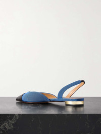 EDITORS'NOTES The slight, gilded heels of Aquazzura's 'Milanese' flats glow brightly as they reflect the light. They are made from grosgrain with chic, leather-trimmed pointed toes. Wear yours with jeans and party dresses alike. SIZE & FIT - Fits true to size, take your normal size - Italian sizing DETAILS & CARE - Slight heel - Light-blue grosgrain, black leather (Lamb) - Elasticated slingback strap - Designer color: Cornflower