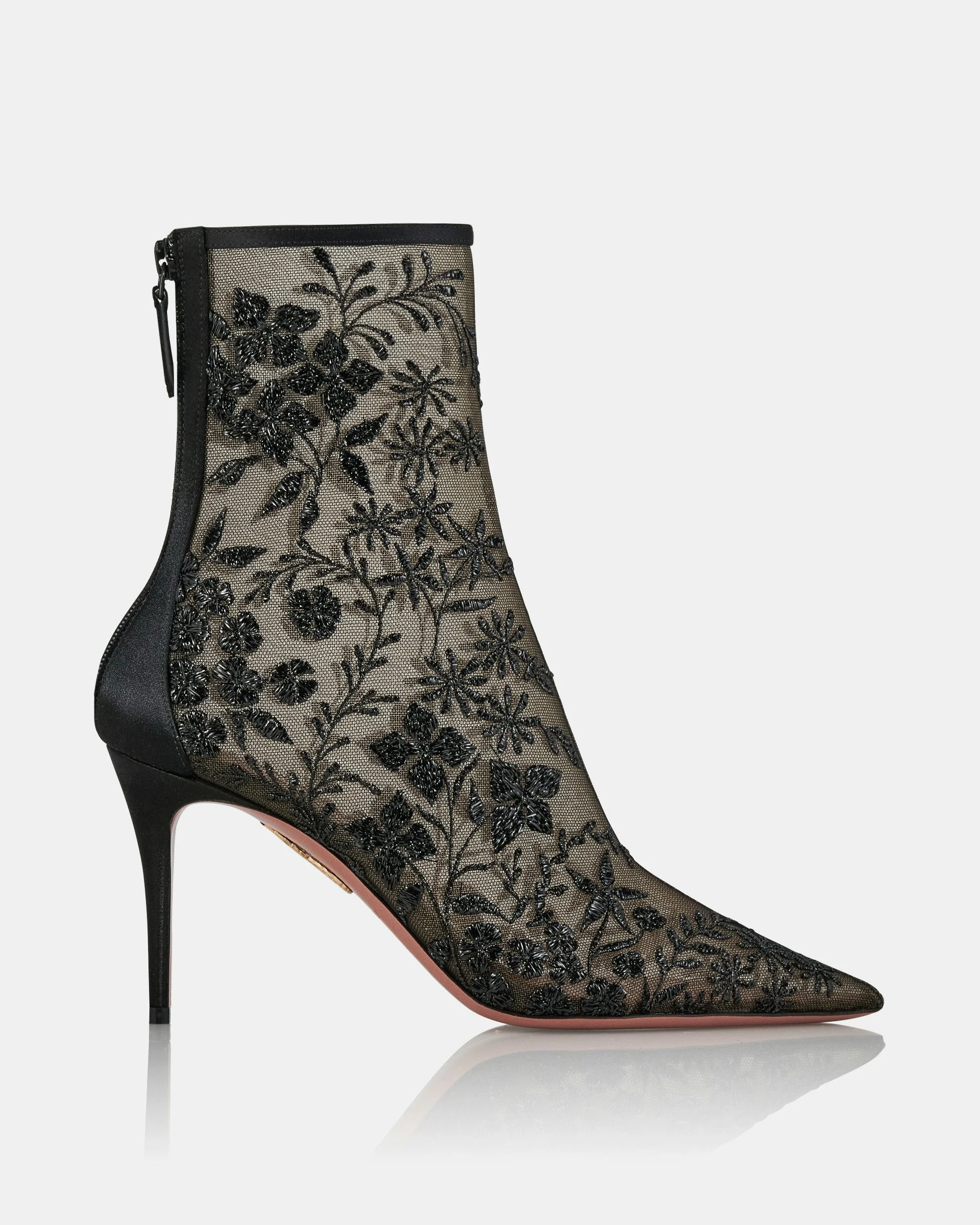 Juxtaposing delicate transparencies with detailed floral embroideries, our Mon Amour Booties are nothing short of extraordinary. They're crafted in Italy from sheer tulle mesh with tonal satin trims adding definition to the sharp pointed-toe shape. The convenient back zipper and manageable 85 mm stiletto heels ensure effortless elegance with every step. Back zipper Mid heel Padded leather insole Signature logo detailing Product: MMUMIDB0-TST-000 Made in: ITALY