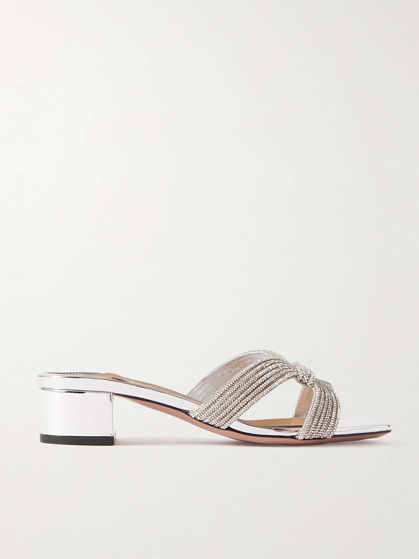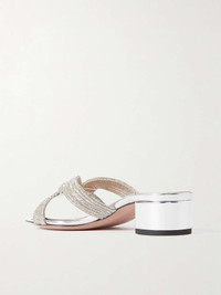 EDITORS'NOTES Aquazzura's name is inspired by the crystal waters surrounding the island of Capri – these 'Muse' mules are designed to evoke the glittering sea. Crafted from metallic leather, they rest on 35mm block heels and have curved, crystal-embellished straps that elegantly frame your feet. Wear yours with a midi dress or cropped pants. SIZE & FIT - Fits true to size, take your normal size - Italian sizing DETAILS & CARE - Heel measures approximately 35mm/ 1.5 inches - Silver leather (Goat) - Slip on