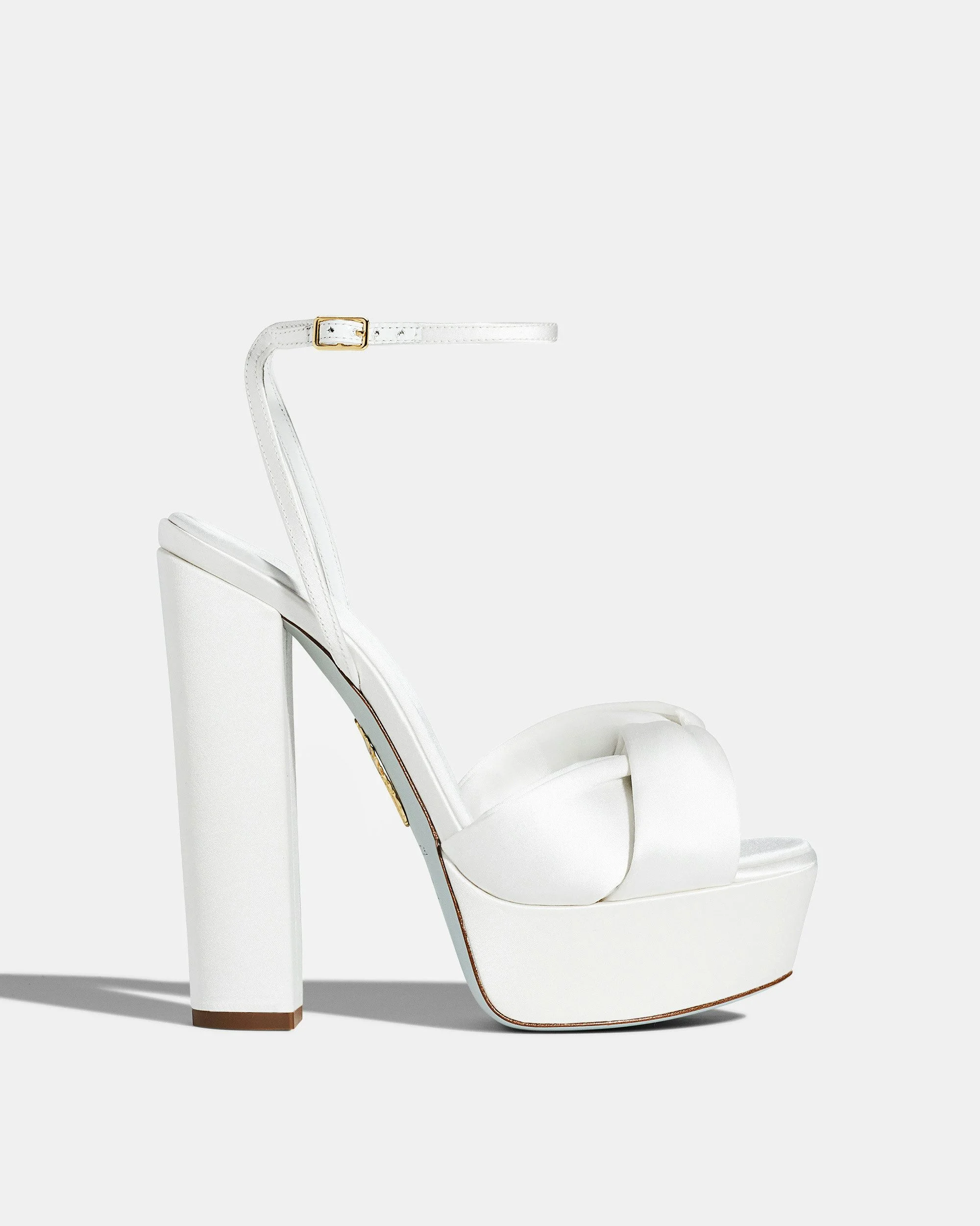 Make a spectacular entrance in these decadent Olie Plateau sandals. Crafted from smooth white satin, they're set on statuesque 140 mm block heels, balanced by chunky platforms. The dainty ankle strap expertly draws attention to the slimmest part of the leg, so style yours with mini hemlines. Adjustable buckle closure Chunky heel Padded leather insole Iconic light blue outsole Signature logo detailing Product: OLEHIGBR-SAT-FFF Made in: Italy