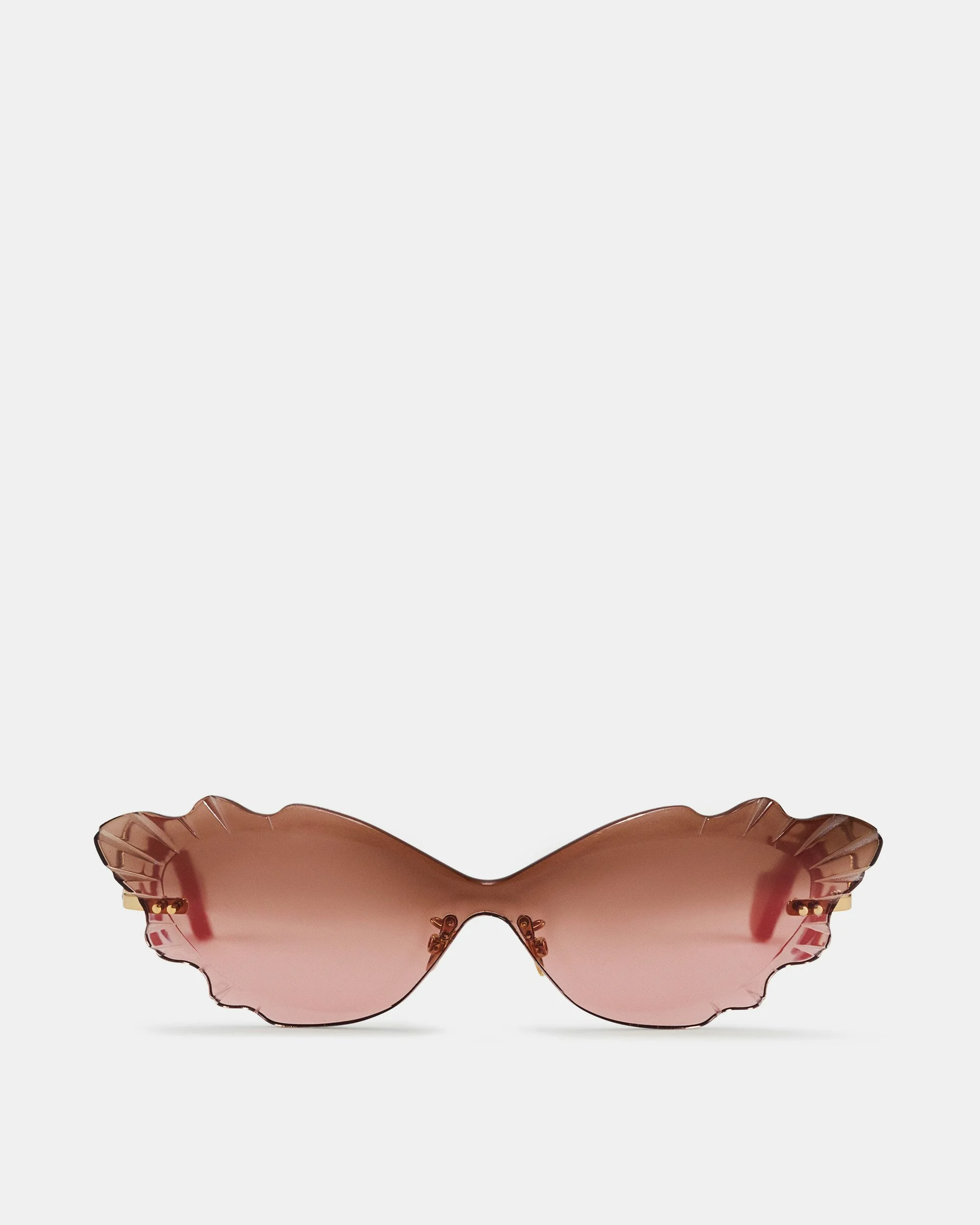 Inspired by the Palm Beach style, these unique sunglasses blend retro glamour with modern femininity. The rimless design has an elongated flower-inspired profile, crafted in Italy from translucent nylon and acetate, paired with textured metal temples shaped to resemble tropical leaves. The subtle interplay of textures adds an intriguing dimension, while the sunset-inspired hues and gold-toned logo are timeless and universally flattering. Special cat-eye shape Nylon and acetate rimless front Metal temples Dark rose lens UV protection Adjustable nose pads Signature logo detailing Silver branded case and cleaning cloth Lens width: 15cm Temple length: 14cm Made in Italy Product: PLMEYES0-ANM-B11 Made in: Italy