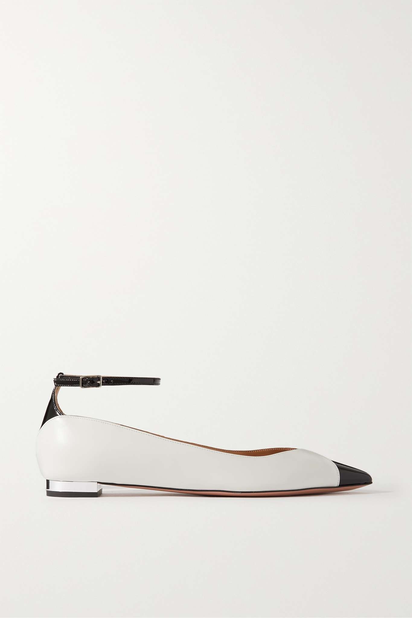 EDITORS'NOTES Ballet flats are huge this season and Aquazzura's 'Pinot' pair is perfect if you want to tap the trend in an especially elegant way. Designed with pointed toes, they're crafted from smooth leather with contrasting patent tips and slim ankle straps. The low heels are covered with silver-tone metal for a sleek finish. SIZE & FIT - Fits true to size, take your normal size - Italian sizing DETAILS & CARE - Slight heel - White leather (Goat), black patent-leather - Buckle-fastening ankle strap