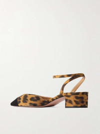 EDITORS'NOTES Embody Parisian chic with Aquazzura's 'French Flirt' pumps. They're crafted from leopard-print suede, tipped with black grosgrain toe caps and set on manageable 35mm block heels. Maximize the style mileage and wear them with everything from jeans to party dresses. SIZE & FIT - Fits true to size, take your normal size - Narrow at the toe - Italian sizing DETAILS & CARE - Heel measures approximately 35mm/ 1.5 inches - Leopard-print suede (Goat), black grosgrain - Buckle-fastening ankle strap