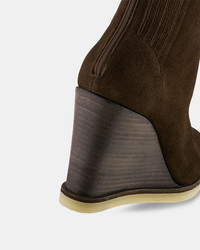 A seasonless staple you'll never tire of wearing, our Saint Honore Wedge Booties are reminiscent of chic 70s styles. Complete with a convenient back zipper and subtle elasticated panels for a close fit, they're crafted from supple suede in a rich chocolate brown shade. The stacked heel enhances the laid-back yet elegant look. Back zipper Low heel Padded leather insole Signature logo detailing Product: SHOMIDW0-SUE-ESP Made in: ITALY