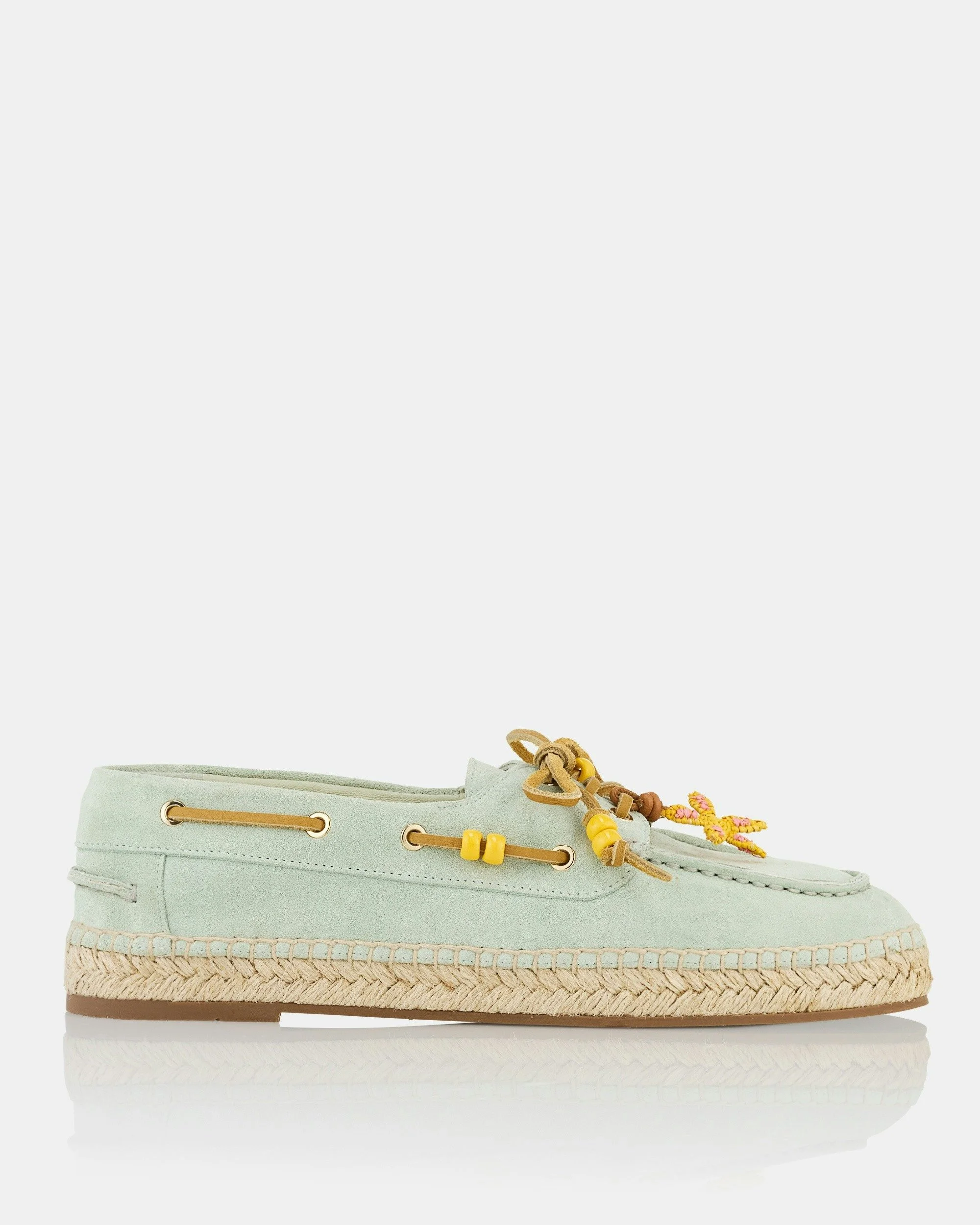 Look to these Seafarer Espadrilles to complete your vacation wardrobe. Made from buttery suede in a deliciously fresh light mint shade, the classic profile is set atop woven soles and finished with playful beads and hand-woven raffia charms, beautifully crafted by Colombian artisans. Lace-up front Flat heel Padded leather insole Signature logo detailing Product: SFRFLAE0-SCC-997 Made in: SPAIN