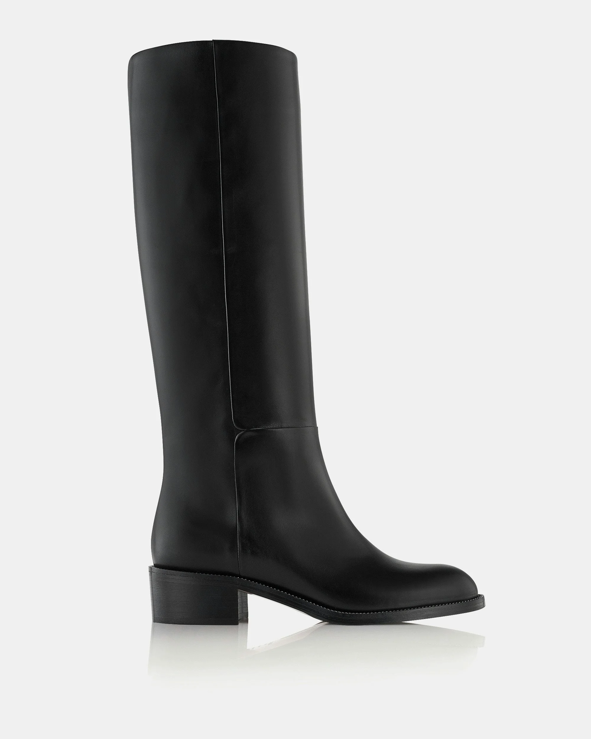The easiest way to upgrade your cold-weather wardrobe: our Sellier Flat Boots. They're crafted from supple black leather and feature a round toe, a wide-cut shaft and a 40 mm heel. Notice the delicate metal trim around the sole that lends them an unexpected touch of luxury. Pull on Round toe Mid heel Padded leather insole Signature logo detailing Product: SELFLAB0-CFI-000 Made in: Italy