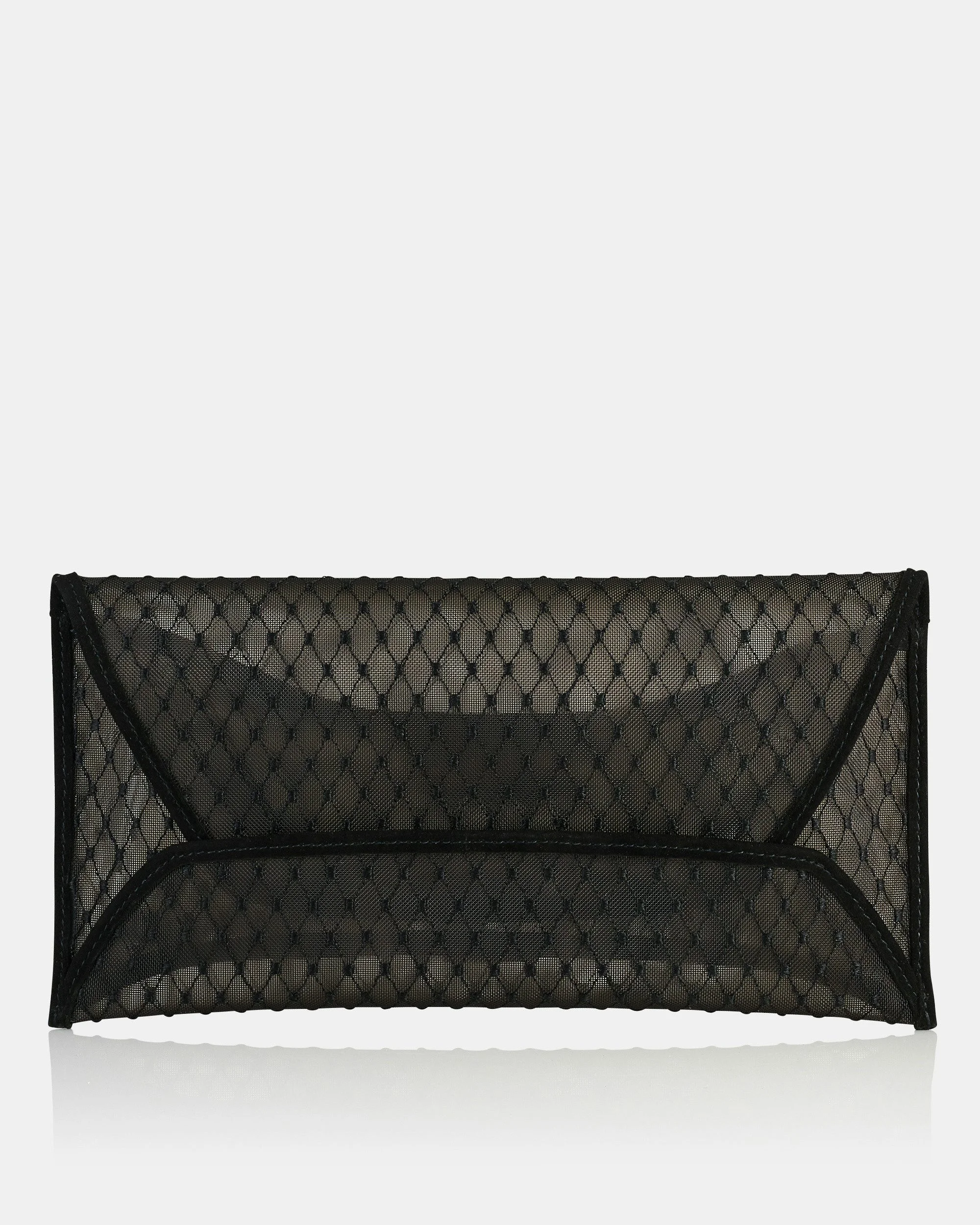 The mesh texture of this Sheer Envelope Clutch is the star of the show. The minimalist silhouette is crafted from lightweight black fishnet enriched with a simple embroidered motif, suede trims, and a gold-toned logo plaque for a signature touch. A modern statement-maker worthy of accompanying the most glamorous ensembles. Tuck-in flap closure Signature logo detailing Aquamarine dust bag Product: SNVCLUC0-FHS-BLD Made in: ITALY