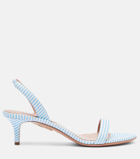 These So Nude sandals by Aquazzura effortlessly blend classic elegance with casual charm. Crafted in Italy from striped leather, this pair features a minimalist silhouette with a 50mm kitten heel—perfect for dancing all night. Product Details - Upper: lamb leather - Lining: leather - Sole: leather insole and sole - Toe shape: almond open toe - Made in Italy - Includes: shoe box, dust bag - Designer color name: Blue/White - Item color: blue, white - Item number: P01076540 Size & Fit - True to size - Slightly narrow at the toe - European sizes - 5cm-2" heel (size EU 38)