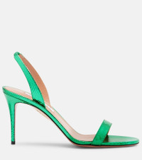 An Aquazzura shoe is a labor of love: a single pair can include over 30 components, each of which is hand-assembled by skilled artisans. Crafted in Italy from metallic snake-effect leather, the So Nude sandals stand on 85mm stiletto heels. Product Details - Upper: leather - Lining: leather - Sole: leather insole and sole - Toe shape: almond open toe - Made in Italy - Includes: shoe box, dust bag - Designer color name: Bright Emerald - Item color: green - Item number: P01097561 Size & Fit - True to size - European sizes - 8,5cm-3.5" heel (size EU 38)