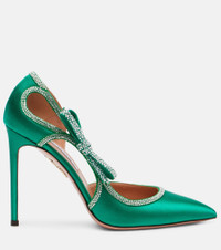 Product Details - Upper: satin, leather (suede) - Lining: goat leather - Sole: leather insole and sole - Toe shape: pointed toe - Made in Italy - Includes: dust bag, shoe box - Designer color name: Emerald - Item color: green - Details: crystals - Item number: P01082564 Size & Fit - Fits slightly small to size - we recommend trying a half size larger - European sizes - 10,5cm-4" heel (size EU 38)