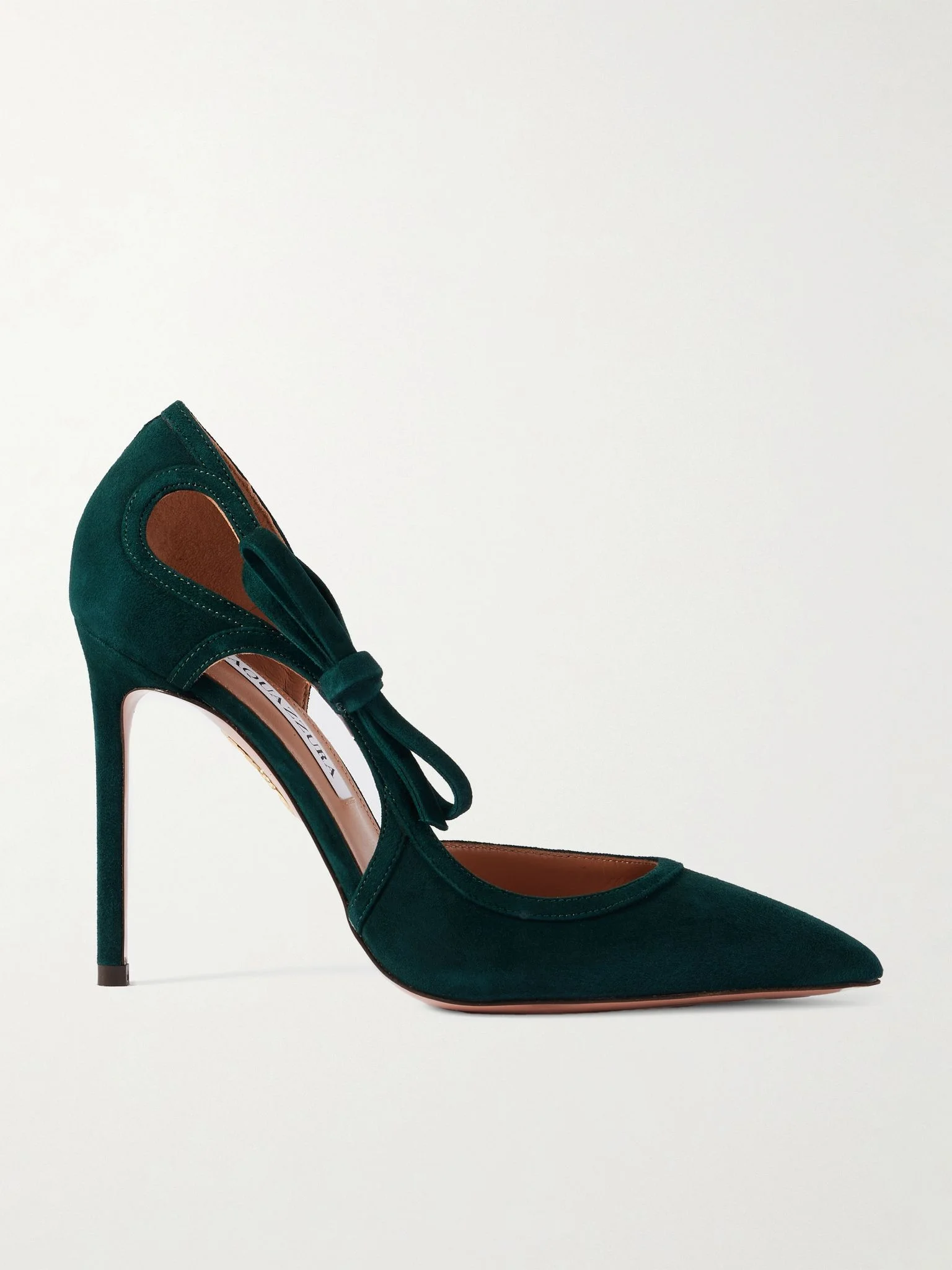 The bows along the sides of Aquazzura's 'Soave' pumps are the prettiest touch. They're made from suede with pointed toes and petal-shaped cutouts to frame the dainty ties. We think they're the perfect way to style this season's pencil skirts. Size & Fit - Fits true to size, take your normal size - Italian sizing Details & Care - Heel measures approximately 105mm/ 4 inches - Dark-green suede (Kid) - Slip on