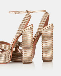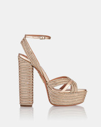 Perfect for special moments, these Sundance Sparkle Plateau Sandals are meticulously crafted in Italy from metallic mirror-effect leather and adorned with stripes of sparkling crystals to match the rose-gold shade. Theyre set on impressive 140 mm block heels, balanced on chunky platforms, and secured with flattering straps across the vamp and around the ankle for a confident stride. Adjustable buckle closure Block heel Crystal embellishments Padded leather insole Signature logo detailing Product: SPKHIGB0-LAM-ROG Made in: Italy