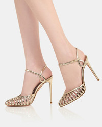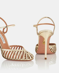 Showcasing a luminous soft-gold mirror effect, our Sweet Surrender Pumps are a radiant take on refined eveningwear. Featuring Aquazzura's signature swirling ankle strap, 105 mm stiletto heels, and a delicate buckle fastening for a secure and elegant fit. Adjustable buckle closure Mid heel Padded leather insole Signature logo detailing Product: SWRHIGP0-SSY-SOG Made in: ITALY
