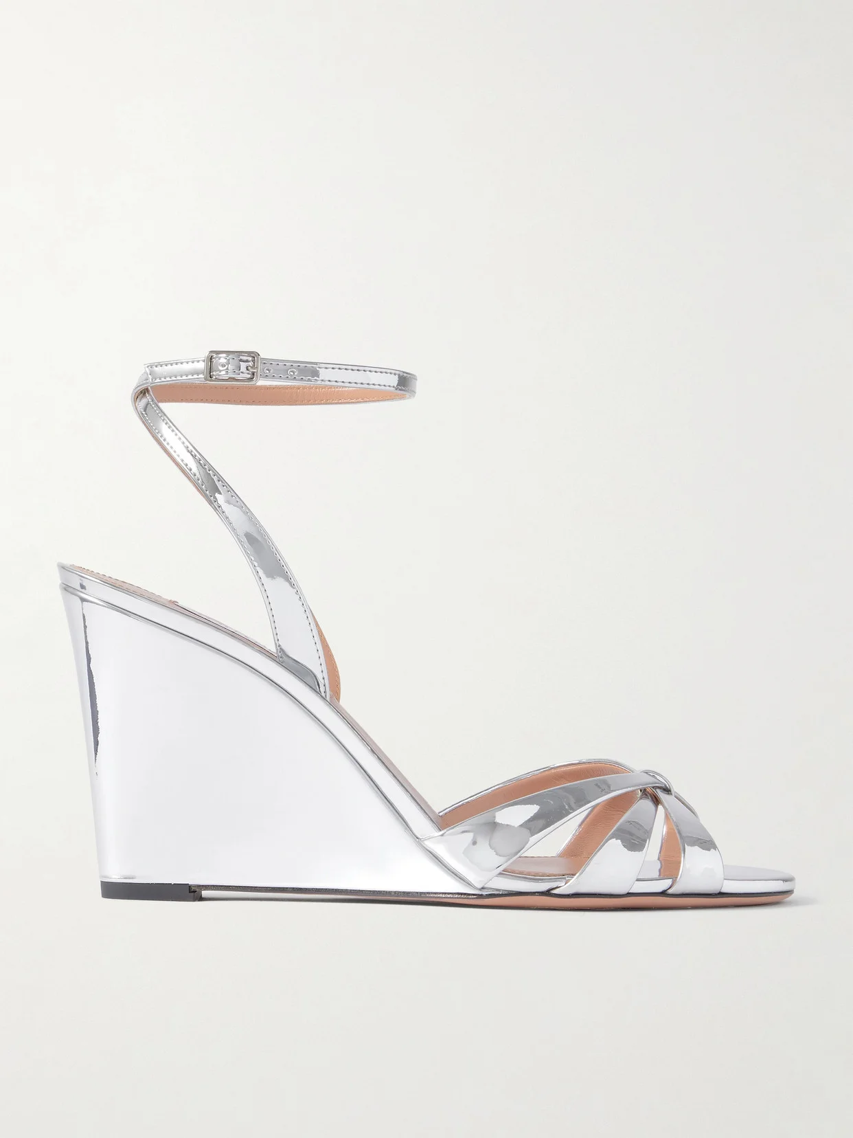 Aquazzura's 'Tati' sandals have slim, sculpted wedges that really show off the mirrored shine of the leather. They've been meticulously crafted in Italy with buckled ankle straps and feature a bow-like detail at the rounded toes.