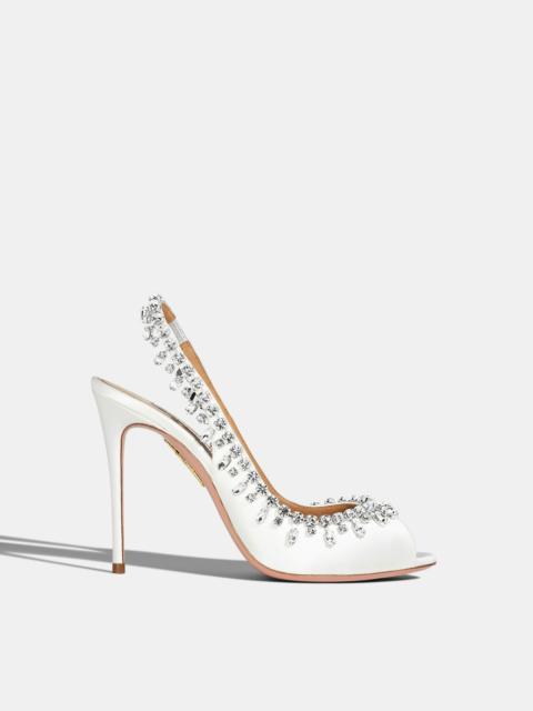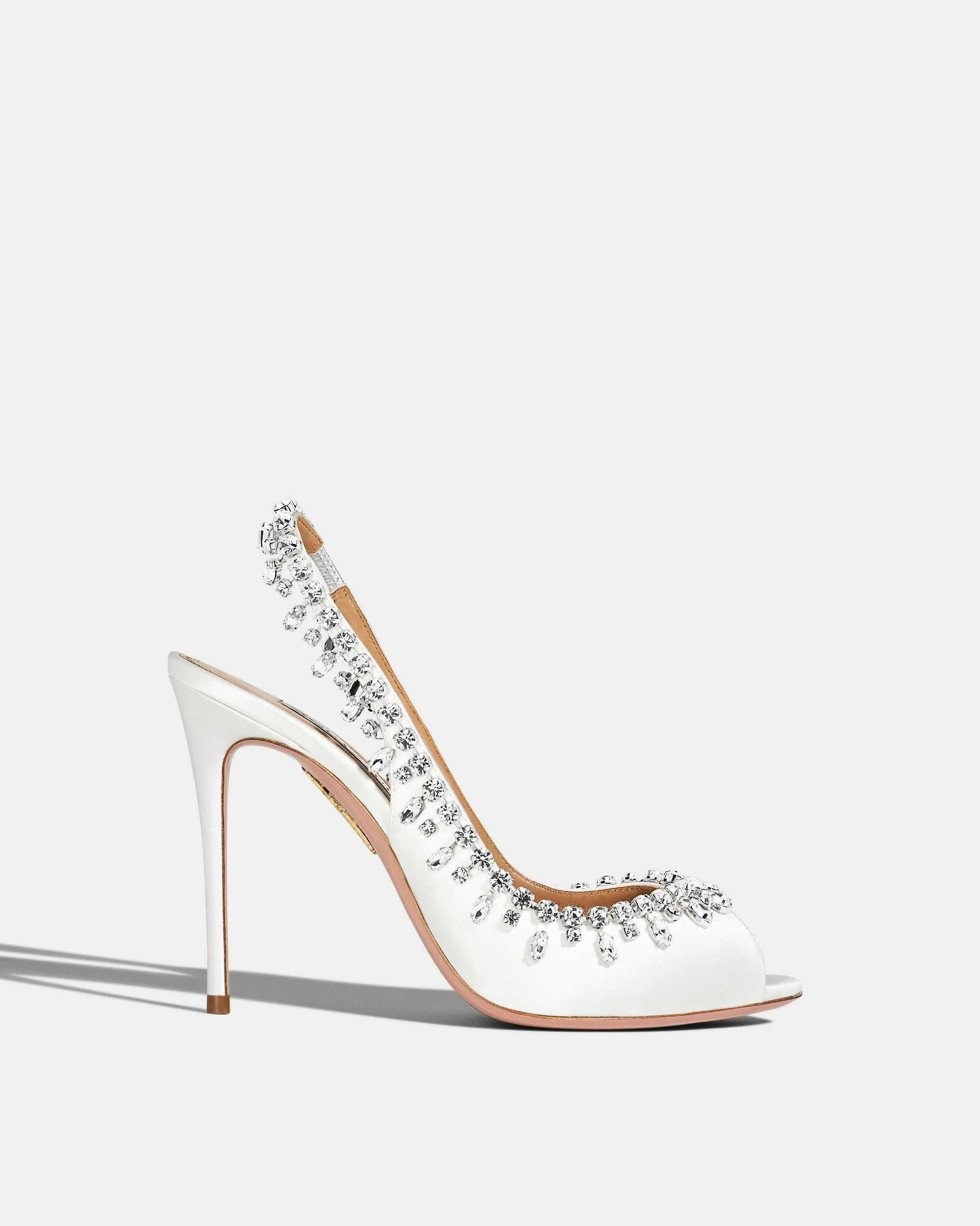 Captivate your audience in a pair of our Temptation Crystal Satin Sandals. Made in Italy from silky satin in fresh white, the style features skin-revealing PVC, glamourous and gleaming gems, a feminine peep toe and is balanced on a slim, stiletto heel. Covered stiletto heel Slingback strap Padded leather insole Leather insole with 'Aquazzura' label Product: TCSHIGS0-SAT-FFF Made in: Italy