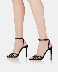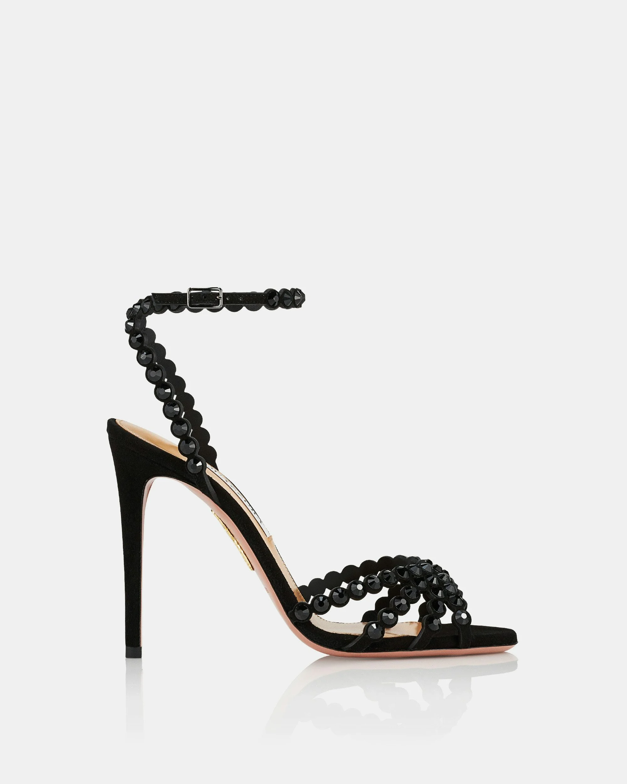 Elegant and glamorous, with a hint of playfulness – our Tequila Sandals are a fabulous option for your next event. This eye-catching pair is crafted from black suede and scattered with tonal crystals for a jewel-like shine. The slim straps keep your foot securely in place, while the 105 mm stiletto heels guarantee all eyes are on you. Adjustable buckle closure Stiletto heel Padded leather insole Signature logo detailing Product: TQLHIGS0-SUE-BJT Made in: Italy