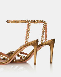 The perfect choice for special occasions, our Tequila Sandals return in a refined cloudy copper hue, crafted from supple laminated nappa. The mesmerising metallic finish and tonal crystals add depth and radiance, while the slender straps and slim stiletto heels exude feminine allure and timeless glamour. Adjustable buckle closure Stiletto heel Crystal embellishments Padded leather insole Signature logo detailing Product: TQLMIDS0-CYN-BRA Made in: ITALY