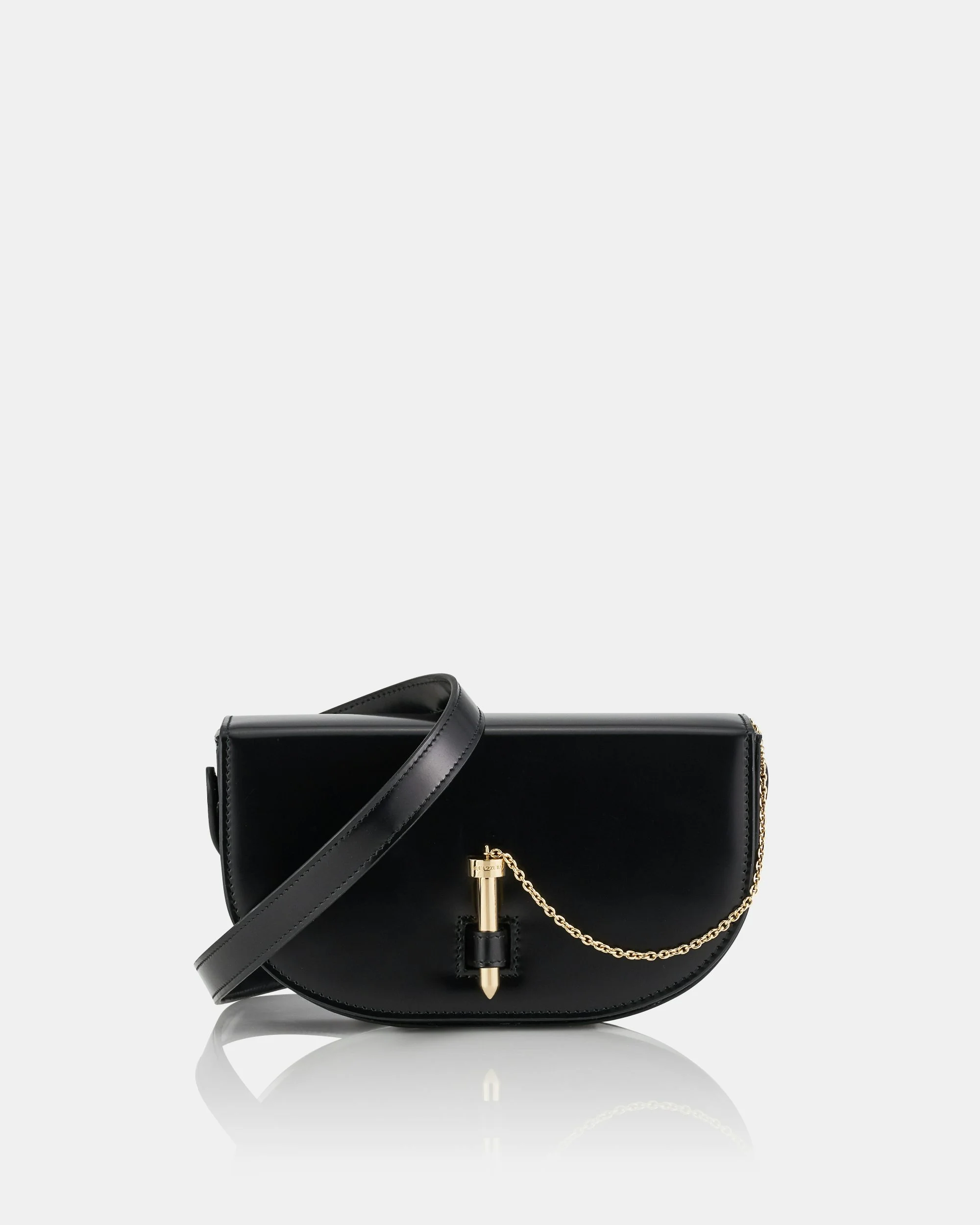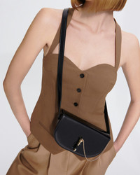 A fresh take on a timeless silhouette – the Tribeca Crossbody bag instantly catches attention with Aquazzuras signature hardware detailing. The rounded shape, reminiscent of vintage designs, is crafted in Italy from brushed calf leather, here in timeless black. The long shoulder strap provides endless styling options. Front flap Long shoulder strap Signature logo detailing Aquamarine dust bag Product: TRCCRBR0-SPZ-BLD Made in: Italy