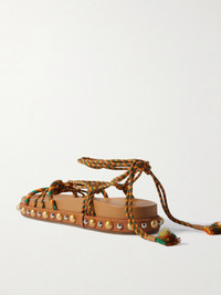 Aquazzura's sandals have colorful raffia straps that are knotted and twisted to frame your feet prettily. They have comfortable molded leather footbeds and are traced with faux pearls and studs along the 15mm soles.