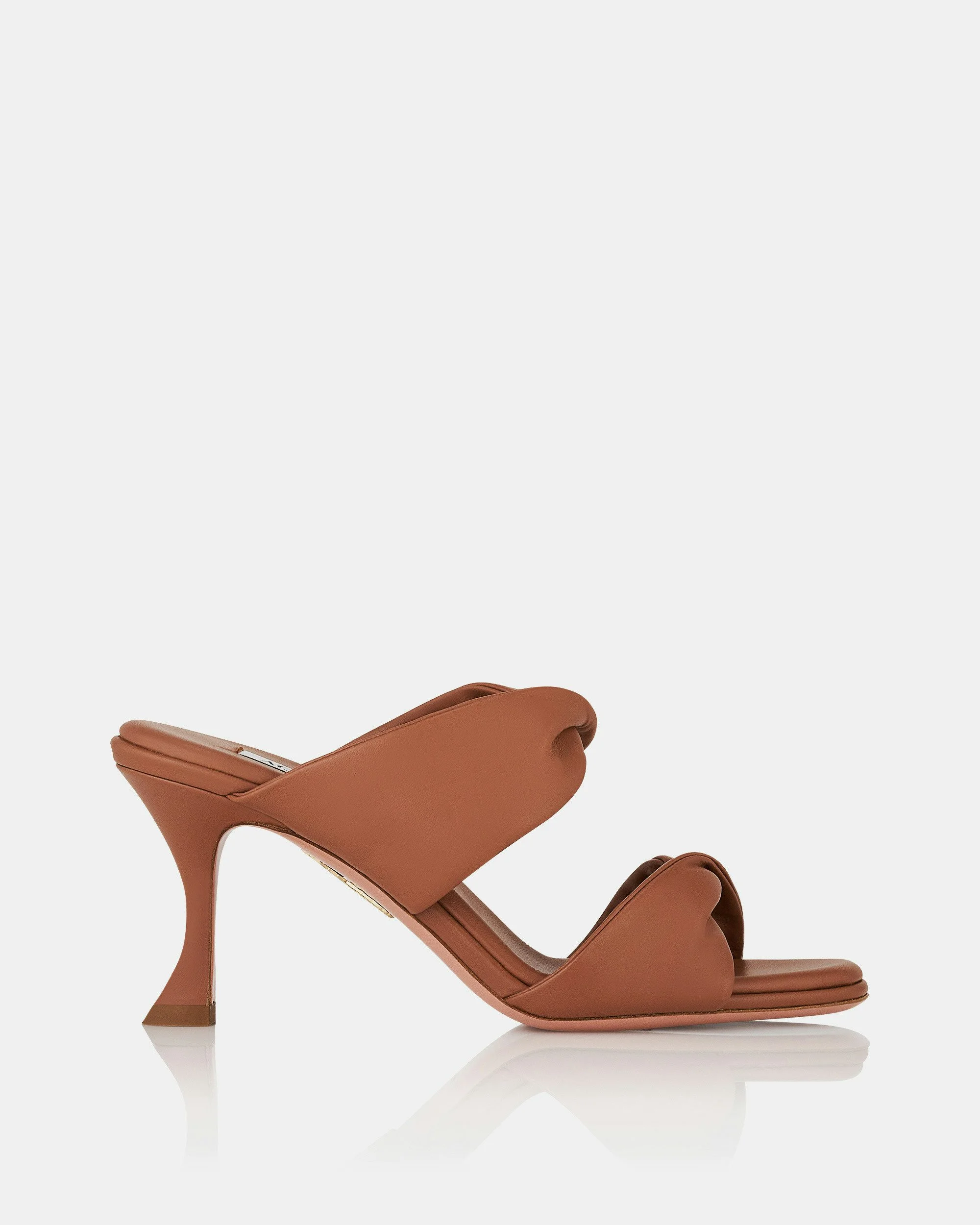 Our Twist Sandals are the perfect accessory for anything from weekend brunch to a cocktail party. Italian-made from supple nappa leather in vintage cuoio, the backless style features two straps that are artfully twisted to highlight and hug the feet. The design is finished on an elegant curved mid heel. Curved stiletto mid heel Open toe Padded leather insole Leather insole with Aquazzura Firenze label Product: TWIMIDS0-NAP-B76 Made in: Italy