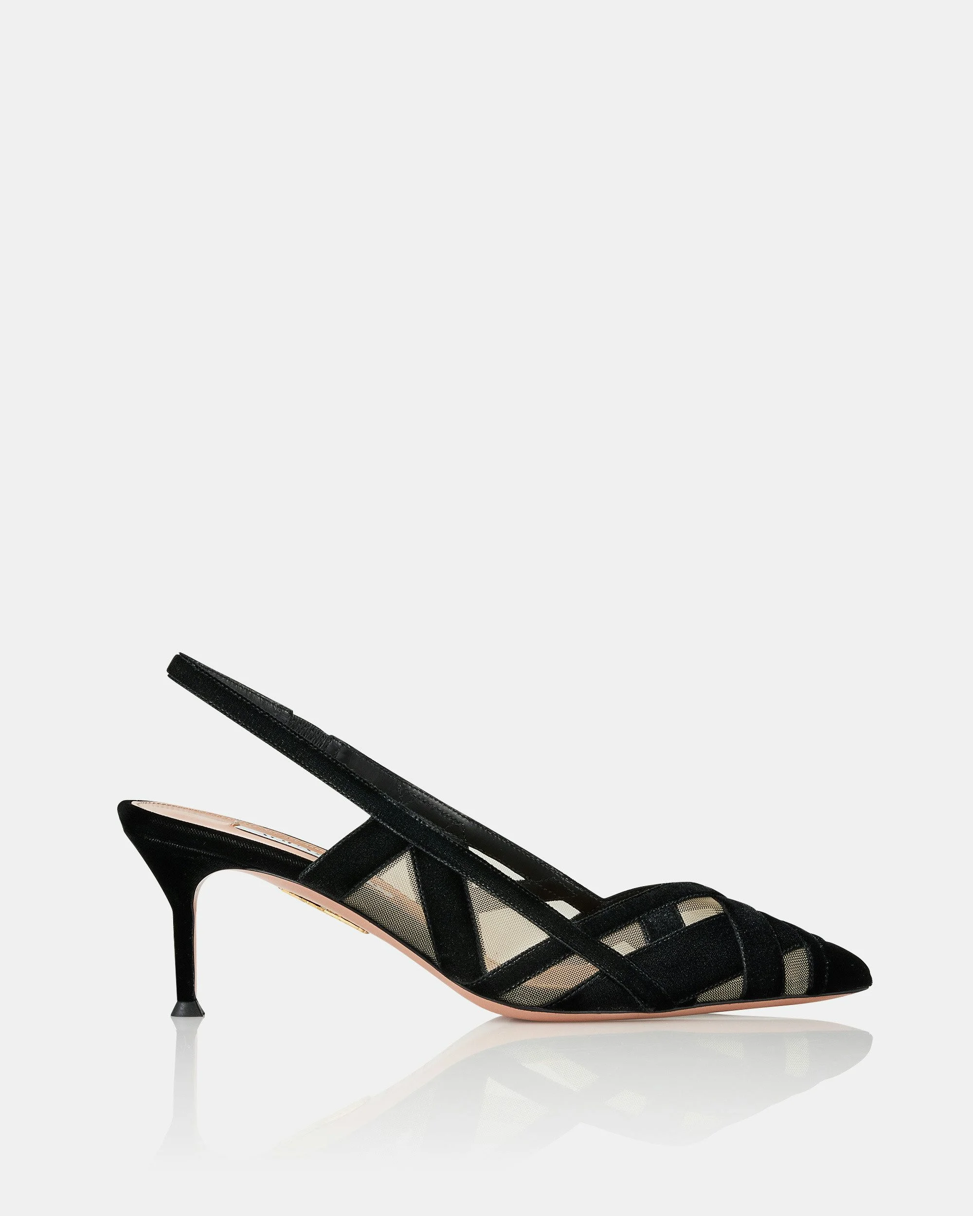 A slingback pump is always a smart addition to your wardrobe, and this Wrap Me Up pair offers a fresh twist on the classic pointed silhouette. Balancing structure and sensuality, the sheer mesh base is overlaid with interwoven velvet straps, creating an abstract cage effect. Timeless in black — always a winner. Slingback strap Mid heel Padded leather insole Signature logo detailing Product: WMUMIDL0-VFM-000 Made in: ITALY