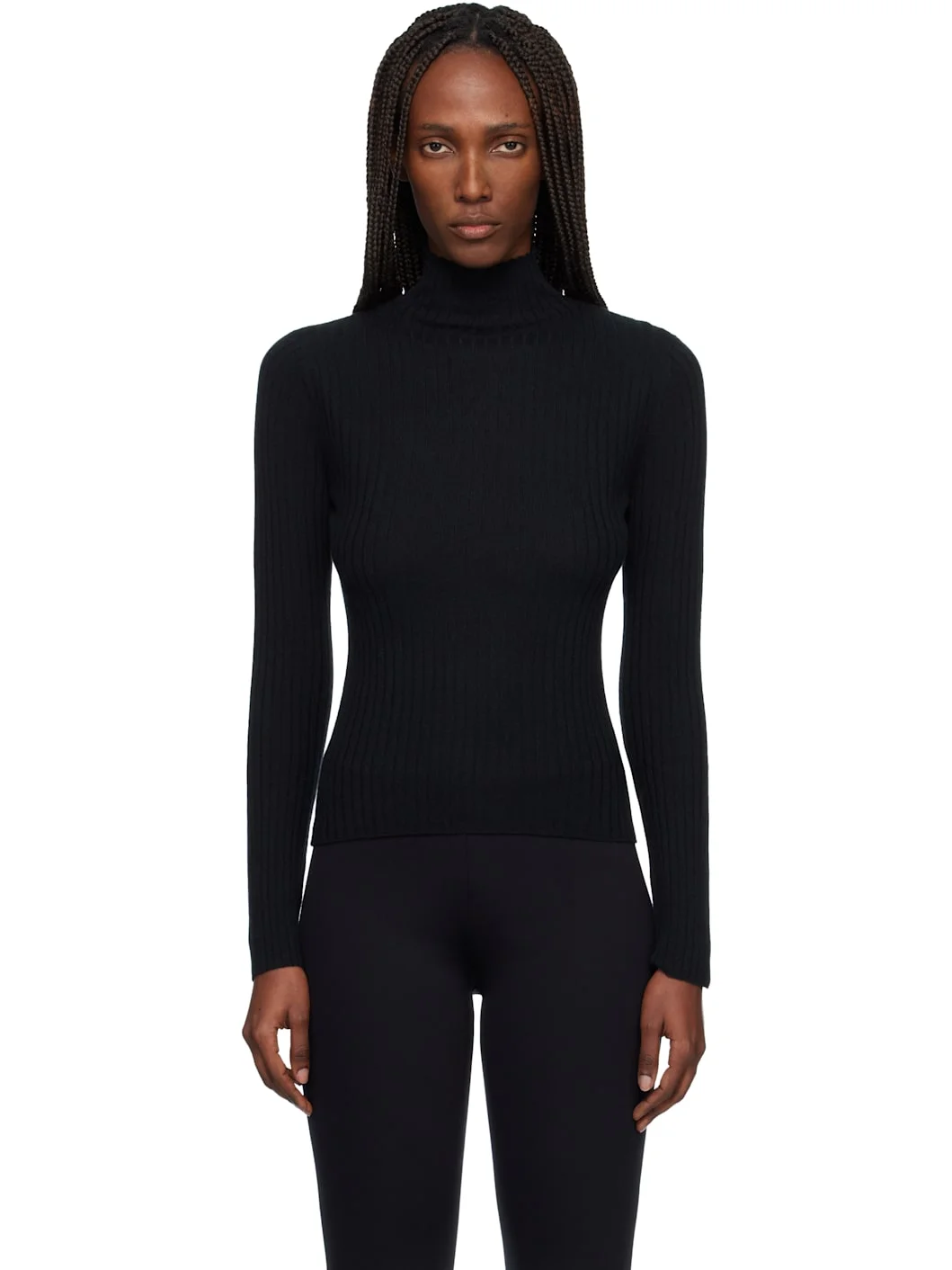 Rib-knit cashmere sweater. · GOTS-certified baby goat cashmere · Mock neck Supplier color: Black 100% baby goat cashmere. Made in United Kingdom 252449F099009