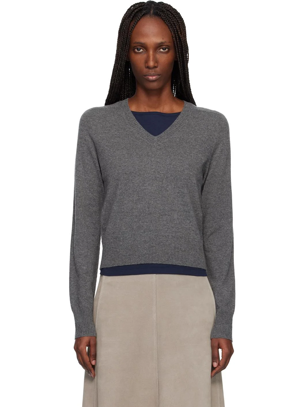 Knit GOTS-certified baby goat cashmere sweater. · Rib-knit V-neck, hem, and cuffs · Saddle shoulders Supplier color: Granite marl 100% baby goat cashmere. Made in China 261449F100003