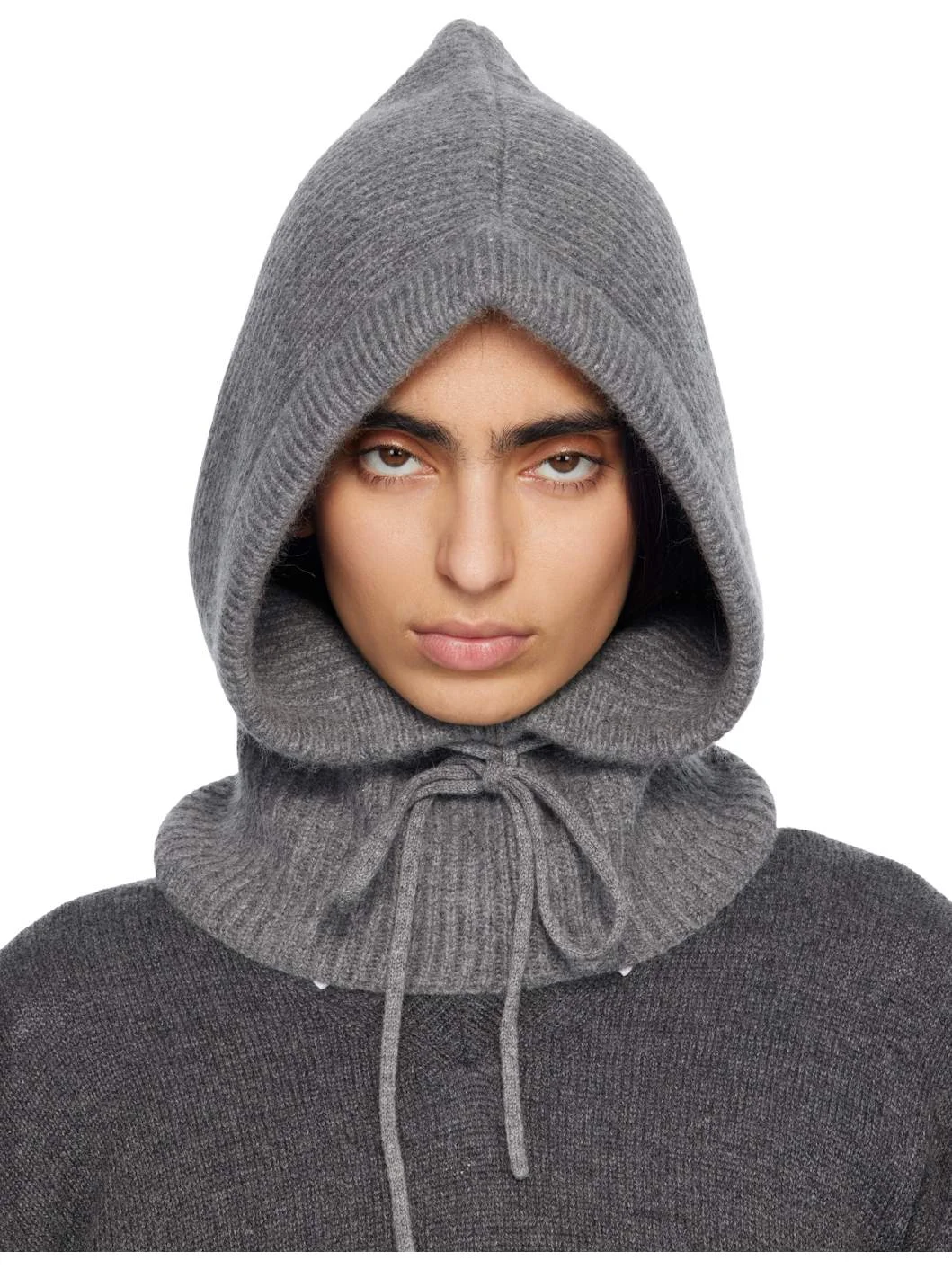 Rib-knit GOTS-certified cashmere balaclava. Drawstring at face. Supplier color: Granite marl 100% cashmere. Made in United Kingdom 252449F014001