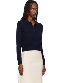 Knit GOTS-certified cashmere polo. · Rib-knit spread collar, hem, and cuffs · Three-button placket Supplier color: Navy 100% baby goat cashmere. Made in United Kingdom 252449F108008