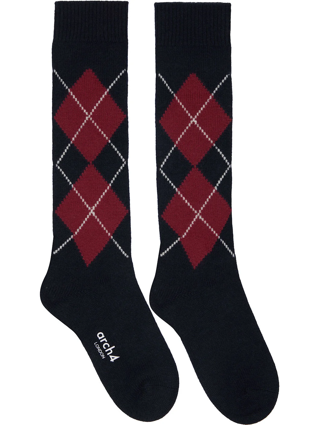 Pair of knee-high knit cashmere socks. · Intarsia argyle pattern throughout · Rib-knit cuffs · Logo printed at sole Available exclusively at SSENSE. Supplier color: Maroon argyle 100% cashmere. Made in China 261449F076001