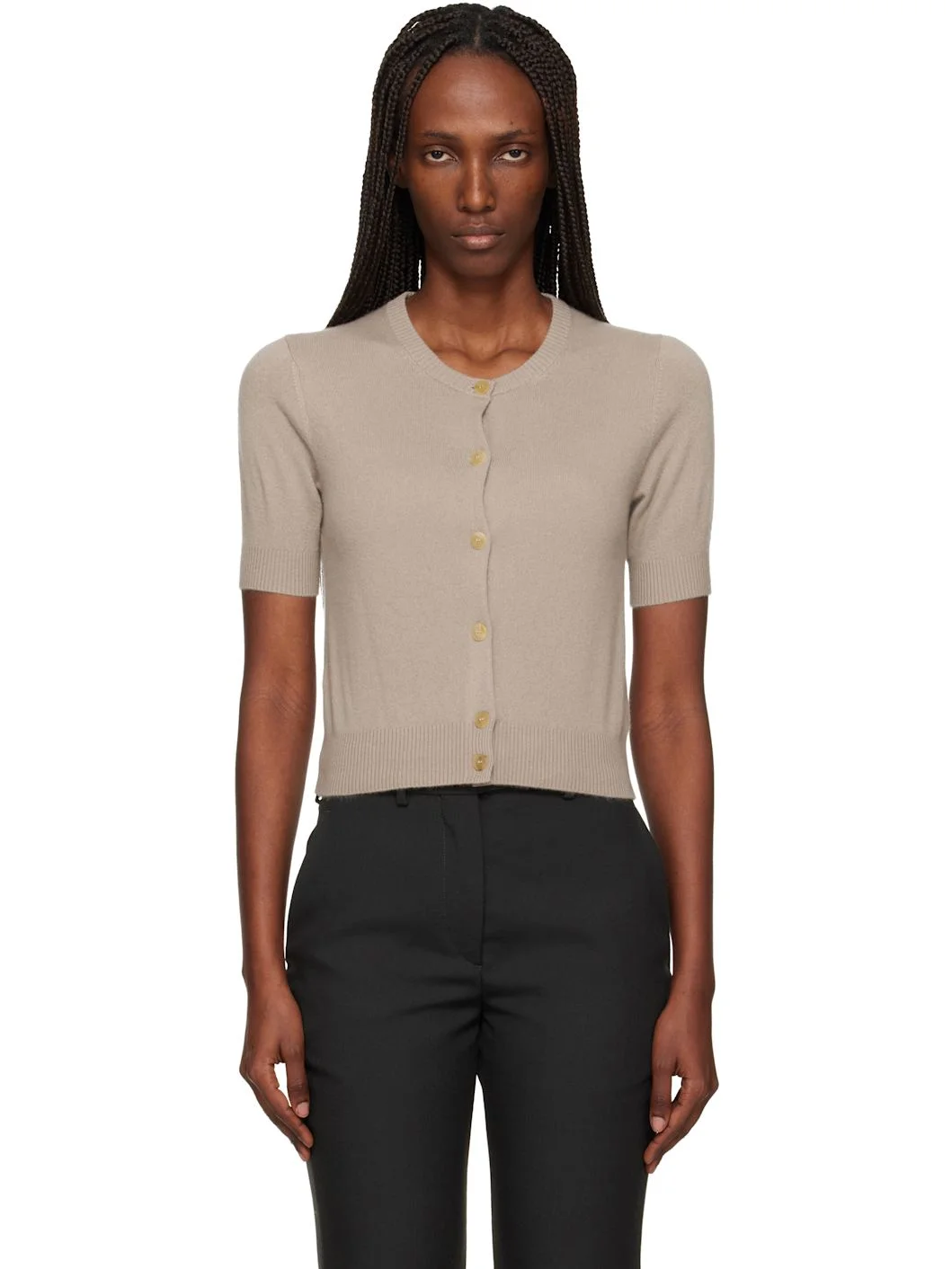Knit GOTS-certified cashmere cardigan. · Rib-knit crewneck, hem, and cuffs · Button closure Supplier color: Ash taupe 100% baby goat cashmere. Made in United Kingdom 252449F095001