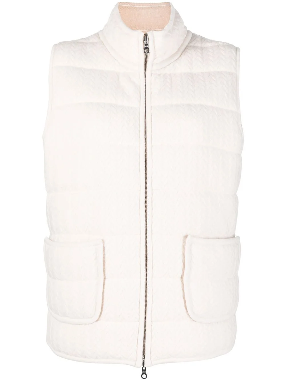 textured-knit padded gilet jacket Highlights - Ivory white - Fawn - Cashmere - Knitted construction - Textured finish - Padded design - Front zip fastening - High neck - Sleeveless Imported Composition Cashmere 100% SIZE & FIT Model measurements Height 5 ft 10 in(1.77 m) Bust/Chest 34.64 in(88 cm) Hips 35.43 in(90 cm) Waist 24.8 in(63 cm) FittingInformation This piece fits true to size. We recommend you get your regular size Cut for a loose fit Made with a mid-weight fabric Washing instructions Dry Clean Only