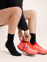 Our lightest, thinnest sock minimizes friction on hikes and mountain runs. Built to hug the foot, our lightest sock minimizes cushioning and aligns with the fit of our shoes to create a system that helps mitigate friction on long mountain runs and hikes. Made with wicking fibres, the performance polyester yarns help manage temperature and moisture. The minimalist design eliminates the toe seam, has a gridded construction at the arch for support and airflow, and a collar height that helps seal out trail debris. Full Product Features Technical Features - Moisture-wicking - Breathable - Lightweight Construction - Made from durable, comfortable 37.5® performance polyester yarns specifically engineered for temperature regulation and climate control - Low-profile grid construction at the arch for breathable comfort and added support - Seamless toe minimizes potential irritation - Mid-height helps prevent slipping and seals out trail debris Logos & Label Configuration - Arc'teryx word logo Sustainability - PFAS (Per- and polyfluoroalkyl substances) Compliant Materials - Self: 63% Polyester, 33% Nylon, 4% Elastane