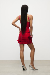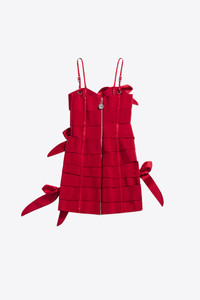 Bandage mini dress with all over bow embellishment. Features adjustable straps and back zipper. Available in Red and Black. - 80% Polyester, 20% Latex - Dry Clean Only - Model is 5'8" and wears a size S