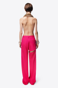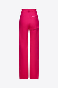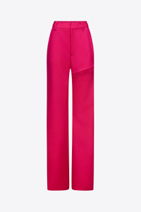 Wool suiting mid rise trouser with asymmetric slits on front and back. Features tuxedo satin braid on outseams. Available in Raspberry & Black. - Made in Italy - 100% Wool - Dry Clean Only - Model is 5'10" and wears a size US 2