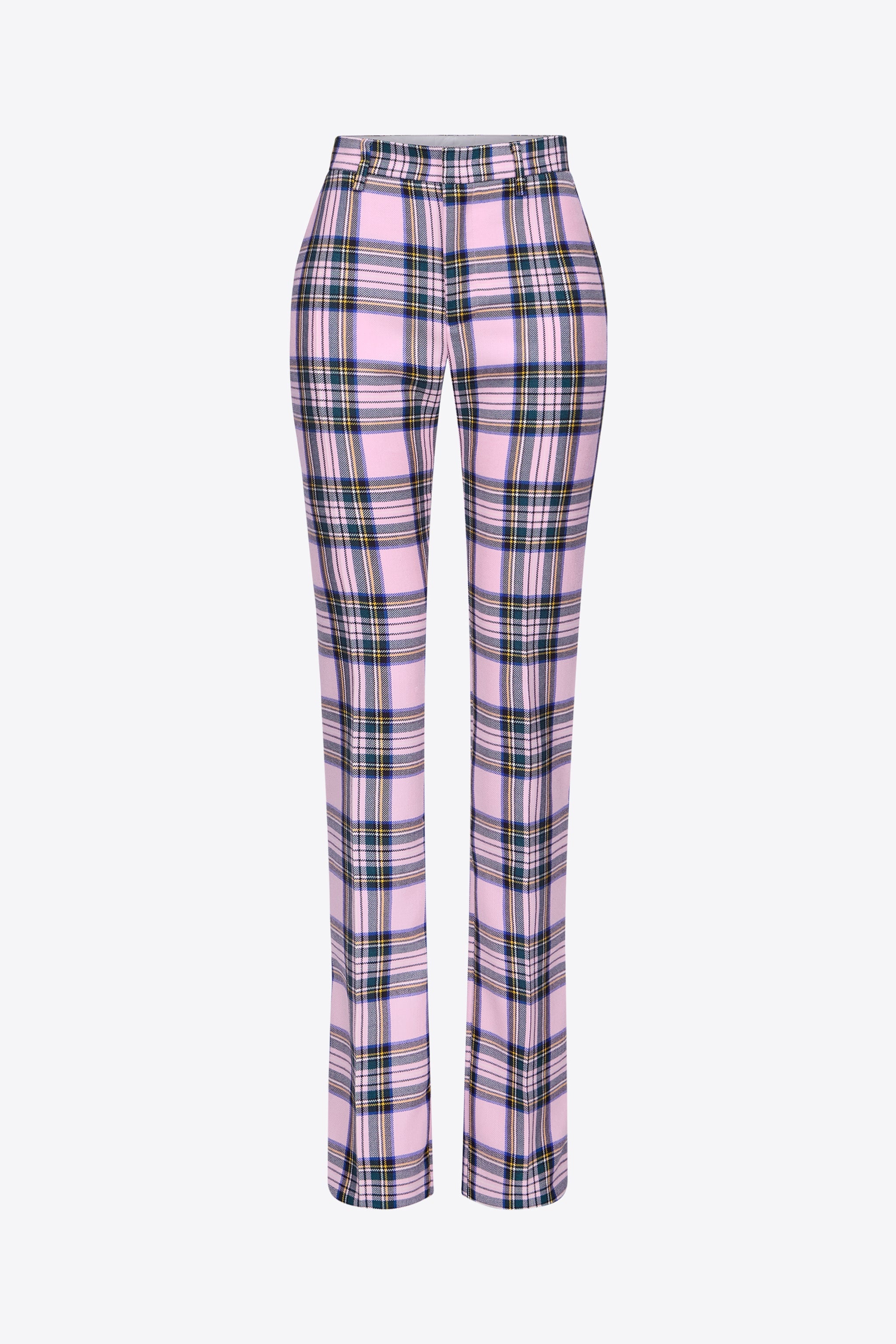 Checked pattern wool suiting mid rise pant with slit details at rear. Features hidden zipper and hook-and-bar closure at center front. Available in Pink Multi. - Made in Italy - 100% Wool - Dry Clean Only - Model is 5'10" and wears a size US 2
